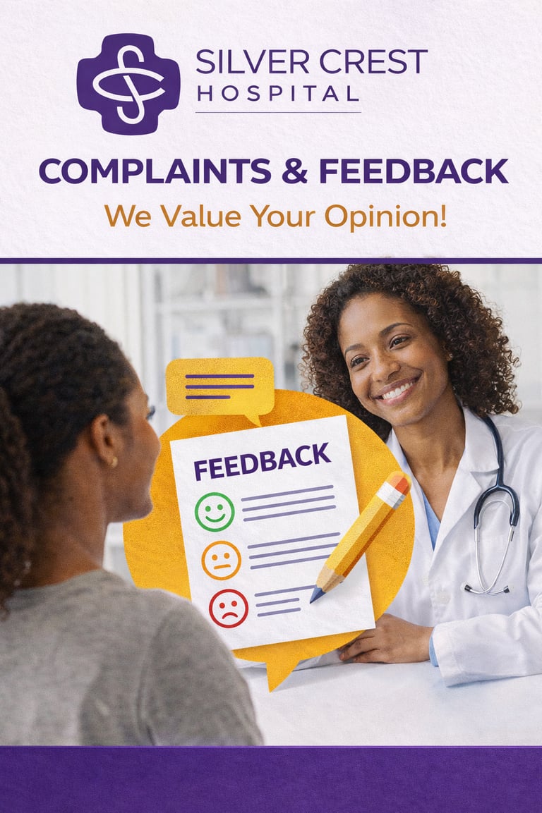 At Silver Crest Hospital, your comfort and satisfaction matter to us. If you experienced any inconvenience, delay, or unsatisfactory service, please share your feedback here. All complaints are confidential and reviewed directly by the Hospital Management Team.